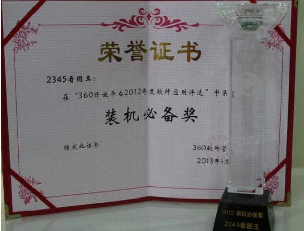 日前,360開放平臺2012年度軟件應用評選結果已全面揭曉,本次活動從參選的480款軟件中評選出裝機必備獎、新秀軟件獎、用戶歡迎獎和行業貢獻獎等14大類獎項。相比去年,今年獲獎名單中增加了不少新銳軟件,其中表現最為突出的就是2345看圖王。它以超過13萬的票數摘得2012年度裝機必備獎!