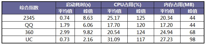 在內存占用方面,由于UC和360內存占用30M以上的機型比較多,拉高了整體數據,所以對比結果中QQ占用內存最少,2345次之,360隨后,UC最大。