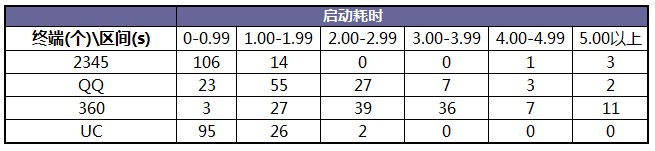 從啟動耗時來看,2345手機瀏覽器的啟動耗時區間大致在0-1.99秒,平均啟動耗時略遜于UC,但遠遠優于QQ和360的啟動耗時。而且測試表現,2345和UC的啟動耗時在各機型上表現波動不大,非常穩定。