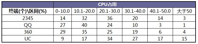 從CPU占用百分比來看,2345手機瀏覽器的占用率大致在10%-40%之間,相對于QQ和360的占用率較高一些。而UC的CPU占用率最高,其CPU占用率超過50%的機型多達15款,占所有機型的12.5%。