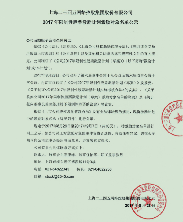 現(xiàn)定于2017年8月29日至2017年9月7日(共10天),對激勵對象名單進(jìn)行網(wǎng)上公示。如公司員工對激勵對象的主體資格合法性、有效性有異議,請在公示期內(nèi)向公司監(jiān)事會提出書面意見,并簽署真實姓名。