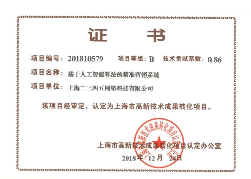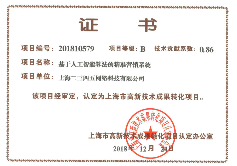 據悉,這已經不是二三四五第一次獲得高新技術成果轉化認證,這充分體現出二三四五的科技研發實力與技術轉化能力。