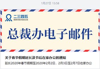 1月27日,2點(diǎn)27分,國務(wù)院辦公廳發(fā)布關(guān)于春節(jié)假期延長的通知。當(dāng)天13點(diǎn)58分,二三四五發(fā)布《關(guān)于春節(jié)假期延長及節(jié)后在家辦公的通知》全員郵件,宣布延長2020年春節(jié)假期至2020年2月2日,并宣布2月3日至2月7日期間,二三四五小伙伴居家遠(yuǎn)程辦公。