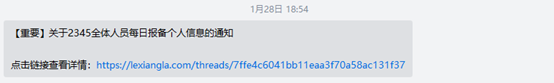 于是1月25日,農(nóng)歷大年初一,二三四五再次發(fā)布通知,提醒全員加強(qiáng)健康報備以及其他防疫注意事項(xiàng)。