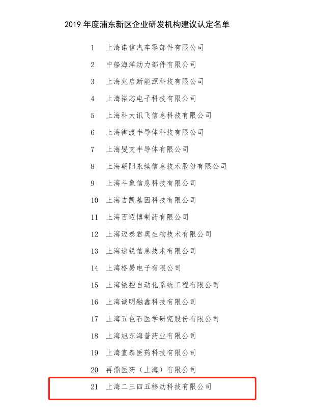 近日,上海市浦東新區科技和經濟委員會“2019年度浦東新區企業研發機構建議認定名單”通過公示,經嚴格審查,上海二三四五網絡控股集團股份有限公司(簡稱“二三四五”,股票代碼002195.SZ)旗下子公司上海二三四五移動科技有限公司被認定為2019年度浦東新區企業研發機構,再獲政府部門肯定。