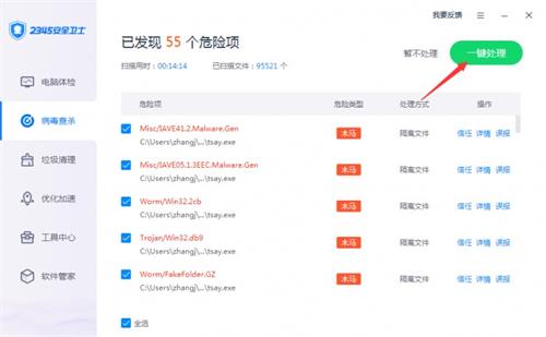 第三步:按照提示「一鍵處理」病毒并重啟電腦