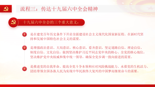 會(huì)議流程三,向各位黨員傳達(dá)黨的十九屆六中全會(huì)精神,強(qiáng)調(diào)十九屆六中全會(huì)召開的重大意義。號(hào)召各位黨員貫徹并落實(shí)“兩個(gè)維護(hù)”的重要內(nèi)容,即“堅(jiān)決維護(hù)習(xí)近平同志黨中央的核心、全黨的核心地位,堅(jiān)決維護(hù)黨中央權(quán)威和集中統(tǒng)一領(lǐng)導(dǎo)”。