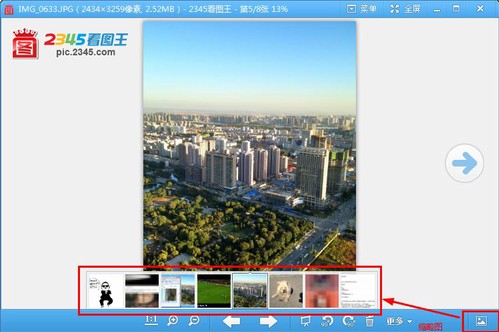 其次,2345看圖王擁有縮略圖功能,點擊看圖窗口右下角“縮略圖”按鈕,顯示縮略圖欄。縮略圖欄顯示內容是當前圖片所在文件夾中的所有圖片。在鼠標滾輪功能設置為圖像縮放情況下,當鼠標指針在縮略圖欄區域內,我們可以通過鼠標滾輪進行翻頁;而當鼠標指針在非縮略圖欄區域內,鼠標滾輪的功能就變成放大縮小(如圖3)。我們可以在快速瀏覽圖片的同時,關注圖片的每一個細節,讓瀏覽圖片更高效。
